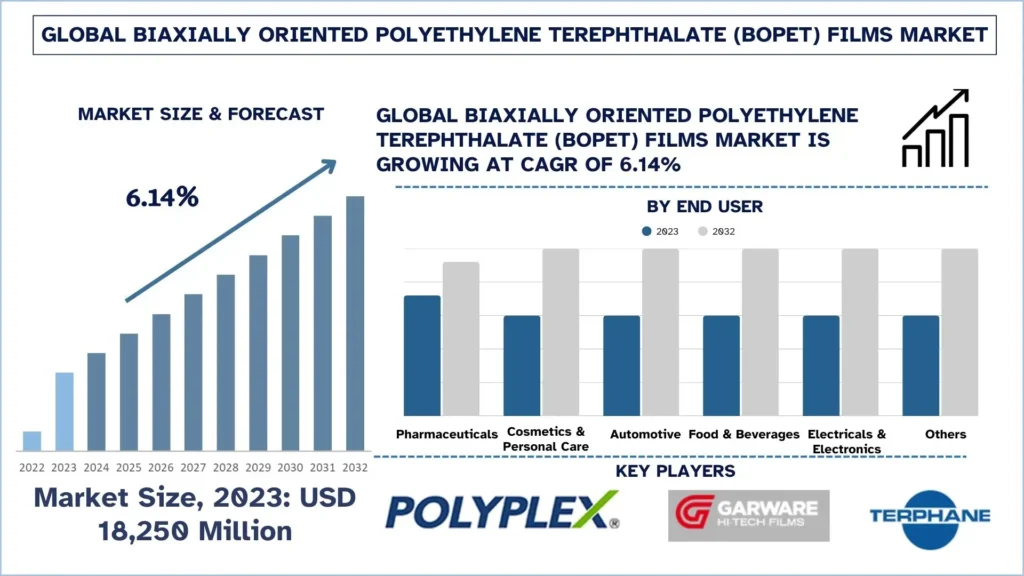 The Biaxially Oriented Polyethylene Terephthalate Films Market was valued at approximately USD ~18,250 million in 2023 and is expected to grow at a substantial CAGR of around 6.14% during the forecast period (2024-2032),