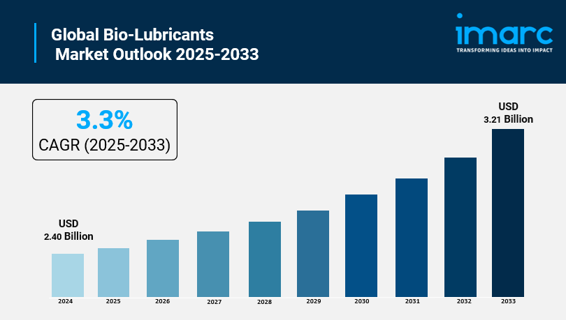 The global bio-lubricants market size reached USD 2.40 Billion in 2024. Looking forward, IMARC Group expects the market to reach USD 3.21 Billion by 2033, exhibiting a growth rate (CAGR) of 3.3% during 2025-2033.