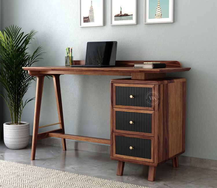 Voice-activated assistants can control lights or playlists, enhancing flow. For cord management, adhesive clips along the back edge route wires invisibly. Wooden Street’s contemporary lines incorporate these features, ensuring your study table design feels cutting-edge yet timeless. Balance gadgets with analog elements—like a leather-bound journal—to ground the space.