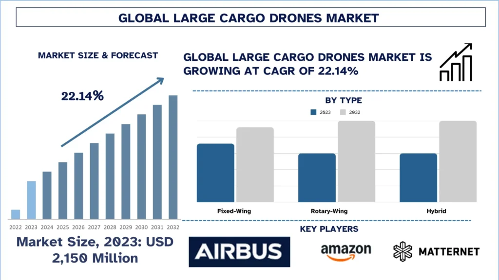 The Global Large Cargo Drones Market was valued at USD 2,150 million in 2023 and is expected to grow at a strong CAGR of around 22.14% during the forecast period (2024-2032)
