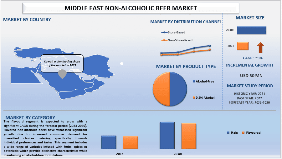 The Middle East Non-Alcoholic Beer Market is expected to reach USD 50 MN in 2030 by growing at a CAGR of 5%.
