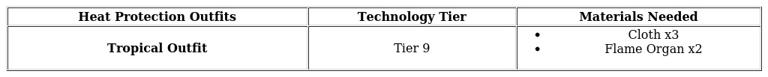 The Tropical Outfit can be unlocked once you have progressed the Technology tab to Tier 9 . In order to make this outfit, you will need to craft: