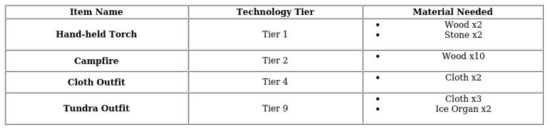 You will be able to make use of the Hand-held Torch at the very start of the Technology tab’s Tier 1 options. Next up will be the Campfire , which you will have access to starting at Tier 2. At Tier 4, you can craft the Cloth Outfit , and at Tier 9 you can craft the Tundra Outfit .