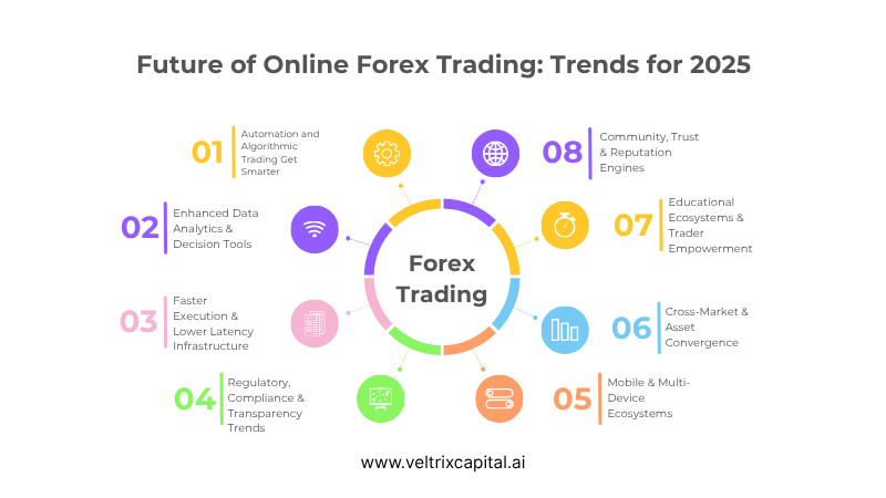 Online forex trading has evolved tremendously in the past decade — and as 2025 approaches, we’re seeing the seeds of a new era of innovation, efficiency, and accessibility. Brokers, traders, and platforms like Veltrix Capital are all racing to adapt. Here’s a close look at the emerging trends shaping the future of forex in 2025 — what to expect, where opportunities lie, and how to position yourself now.