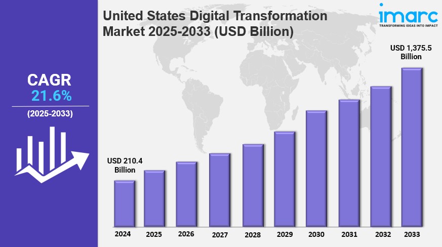 The United States digital transformation market size reached USD 210.4 Billion in ​2024​. Looking forward, IMARC Group expects the market to reach USD 1,375.5 Billion by ​2033​, exhibiting a growth rate (CAGR) of 21.6% during 2025-2033.